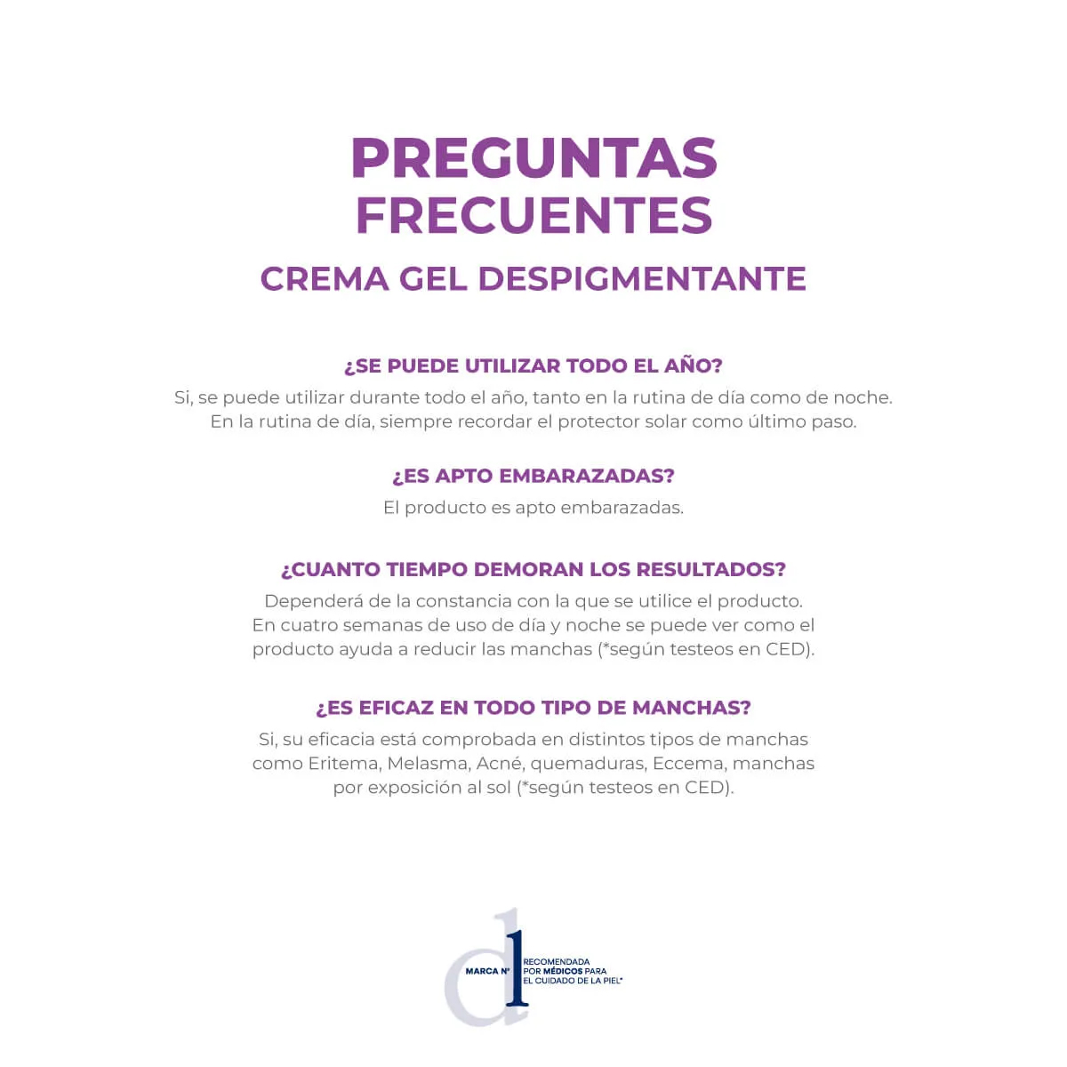 Especialmente formulada para ayudar a reducir la sobreproducción de melanina, responsable de la hiperpigmentación. Ayuda a reducir manchas y evitar nuevas apariciones. Hidrata, ilumina y unifica el tono de la piel. Hipoalergénica – Apta para pieles sensibles – Testeada dermatológica y oftalmológicamente – No comedogénica – Sin TACC – Sin parabenos – No testeada en animales – Apta embarazo.