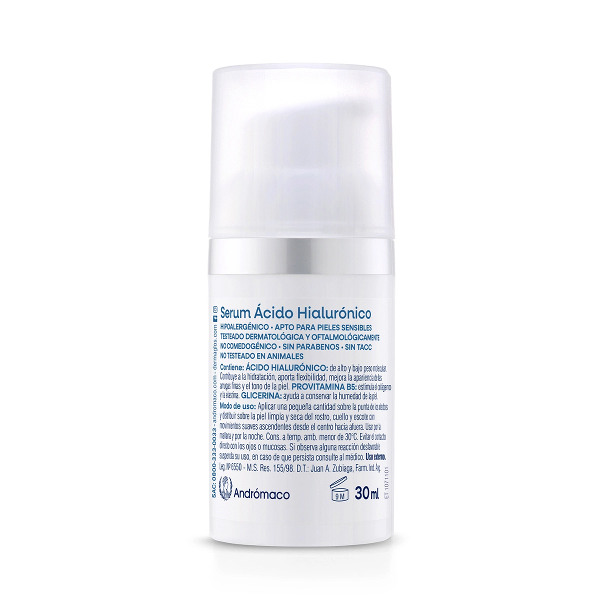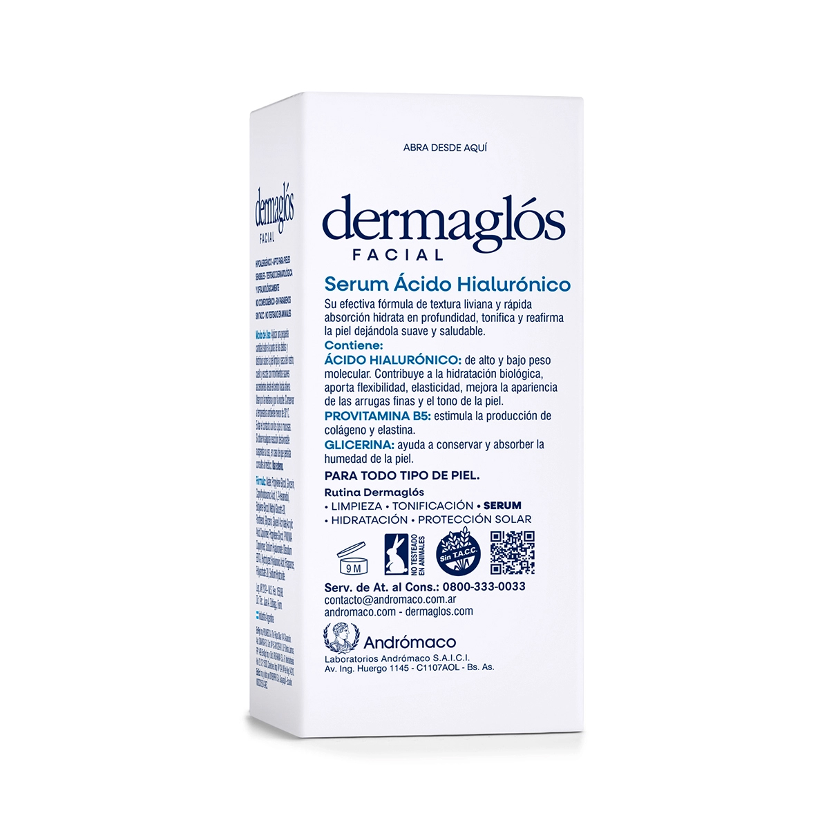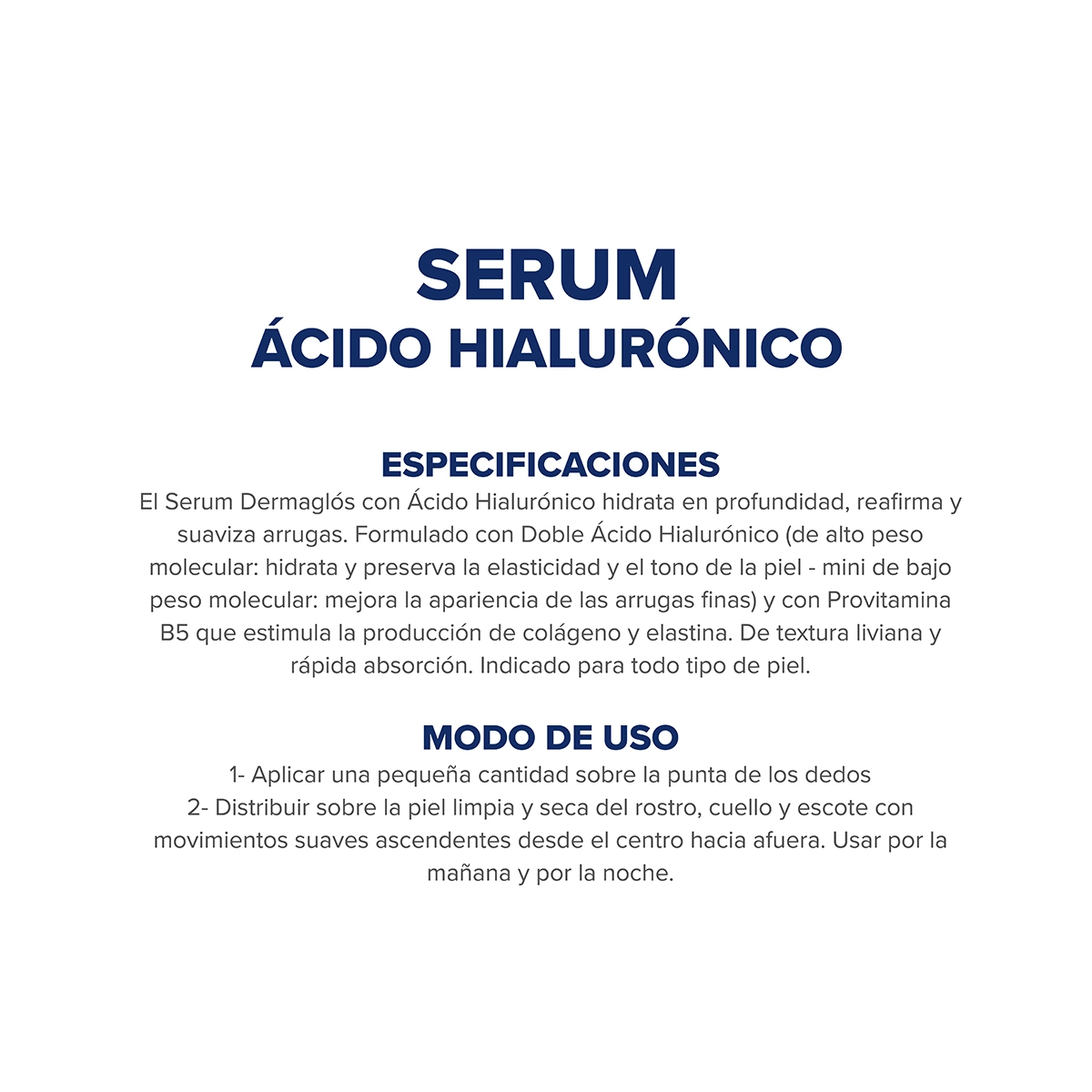 Serum de textura liviana y rápida absorción hidrata en profundidad, tonifica y reafirma la piel. Formulado con Doble Ácido Hialurónico (de alto peso molecular: hidrata y preserva la elasticidad y el tono de la piel - de bajo peso molecular: mejora la apariencia de las arrugas finas) y con Provitamina B5 que estimula la producción de colágeno y elastina. Hipoalergénico – Apto piel sensible – Testeado dermatológica y oftalmológicamente – No comedogénico – Sin TACC – Sin parabenos – No testeado en animales